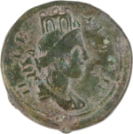 turreted and draped bust of Nymph Nicaea wearing ivy wreath, right