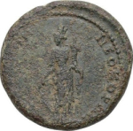 turreted Tyche standing, facing, head, left, holding rudder and cornucopia