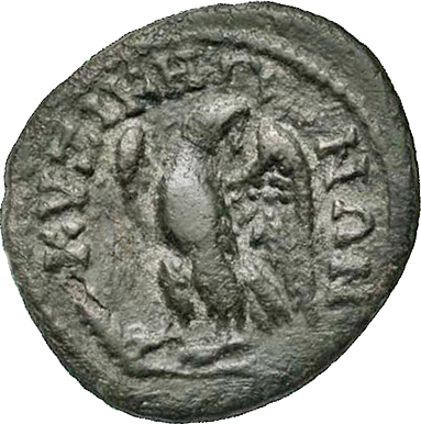 eagle standing on palm-branch, left, head, right, spreading wings, holding wreath in beak