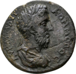 laureate-headed bust of Commodus (long beard) wearing cuirass and paludamentum, right, seen from rear