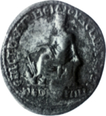 turreted Tyche seated on rock, left, holding rudder, resting left arm on rock |