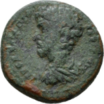 bare-headed bust of Marcus Aurelius (medium length beard) wearing cuirass and paludamentum, left, seen from rear