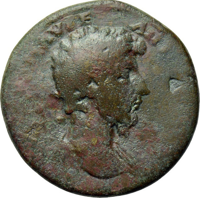 bare head of Marcus Aurelius (long beard with short curls?) with traces of drapery, right