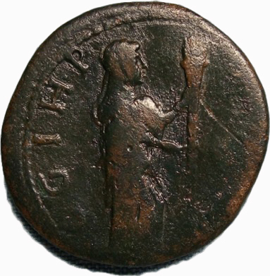 Ceres/Demeter standing, right, holding long torch with both hands; coiling around bottom of torch, serpent