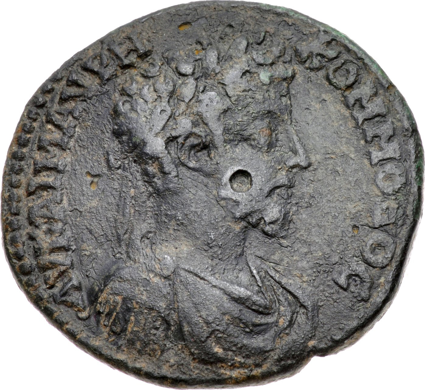 laureate-headed bust of Commodus (short beard) wearing cuirass and paludamentum, right, seen from front