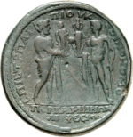 to left, bearded representative of Pergamum (Pergamos or the Demos) standing, right, holding statue of Asclepius and sceptre; to right, youthful hero of Ephesus (Androklos or Ephesos?) standing, left, holding statue of Artemis and sceptre |
