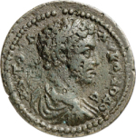 laureate-headed bust of Commodus (short beard) wearing cuirass and paludamentum, right, seen from rear