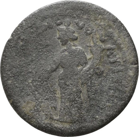 Tyche standing, left, wearing kalathos, holding rudder and cornucopia