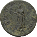 Isis standing, left, wearing basilium, holding sistrum and hem of skirt