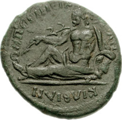 river-god Kilbos (bearded) reclining, left, holding reed, resting on water-urn