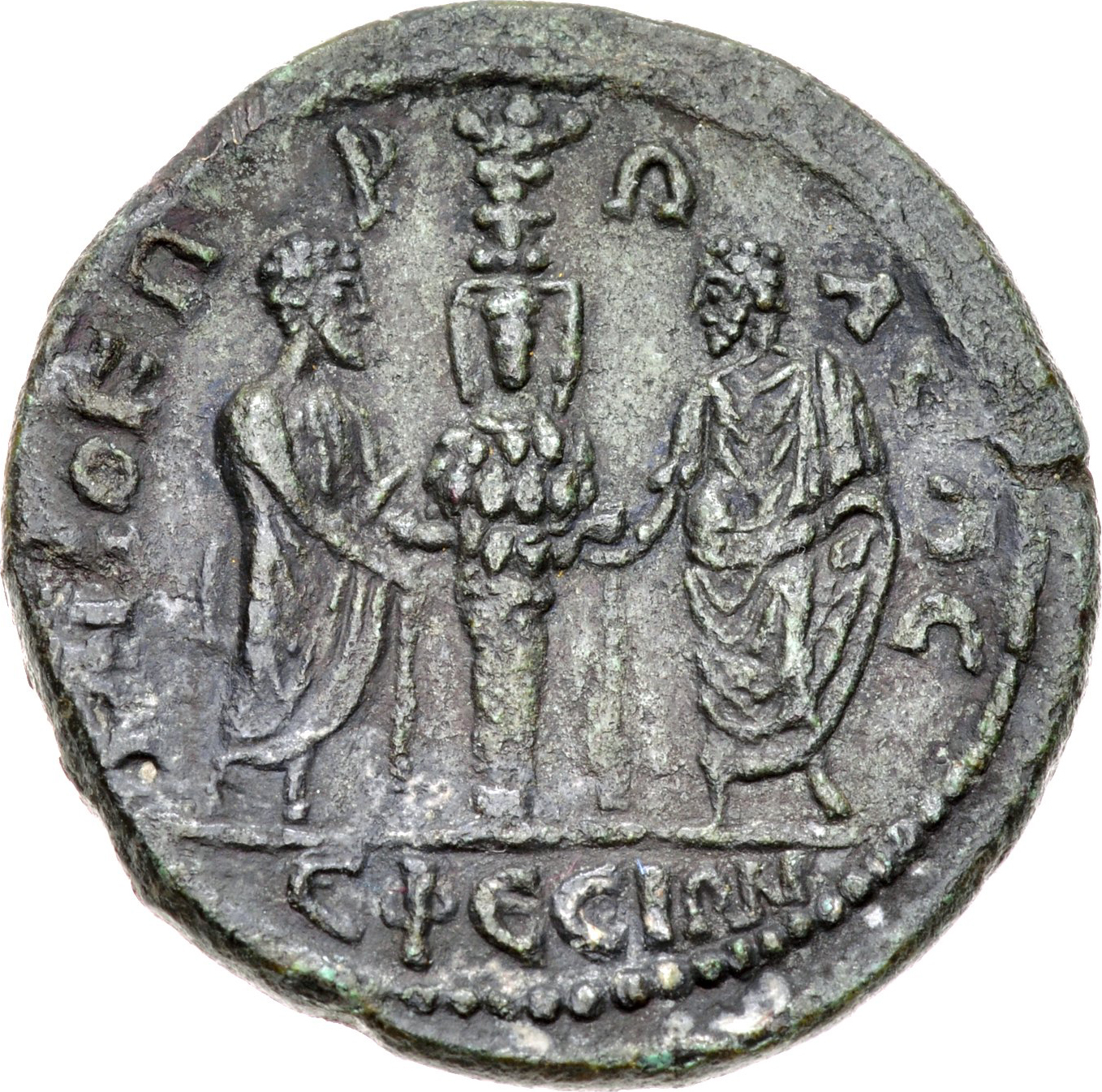in centre, cult statue of Artemis of Ephesus standing, facing, wearing kalathos, having supports; between two emperors (Marcus Aurelius and Lucius Verus) standing, facing each other, each wearing toga and holding patera