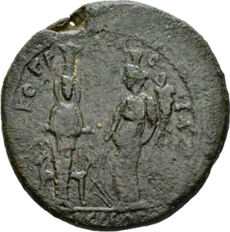 to left, cult statue of Artemis of Ephesus standing, facing, wearing kalathos, having supports; between two stags; to right, Tyche standing, left, wearing kalathos, holding ruder and corucopia