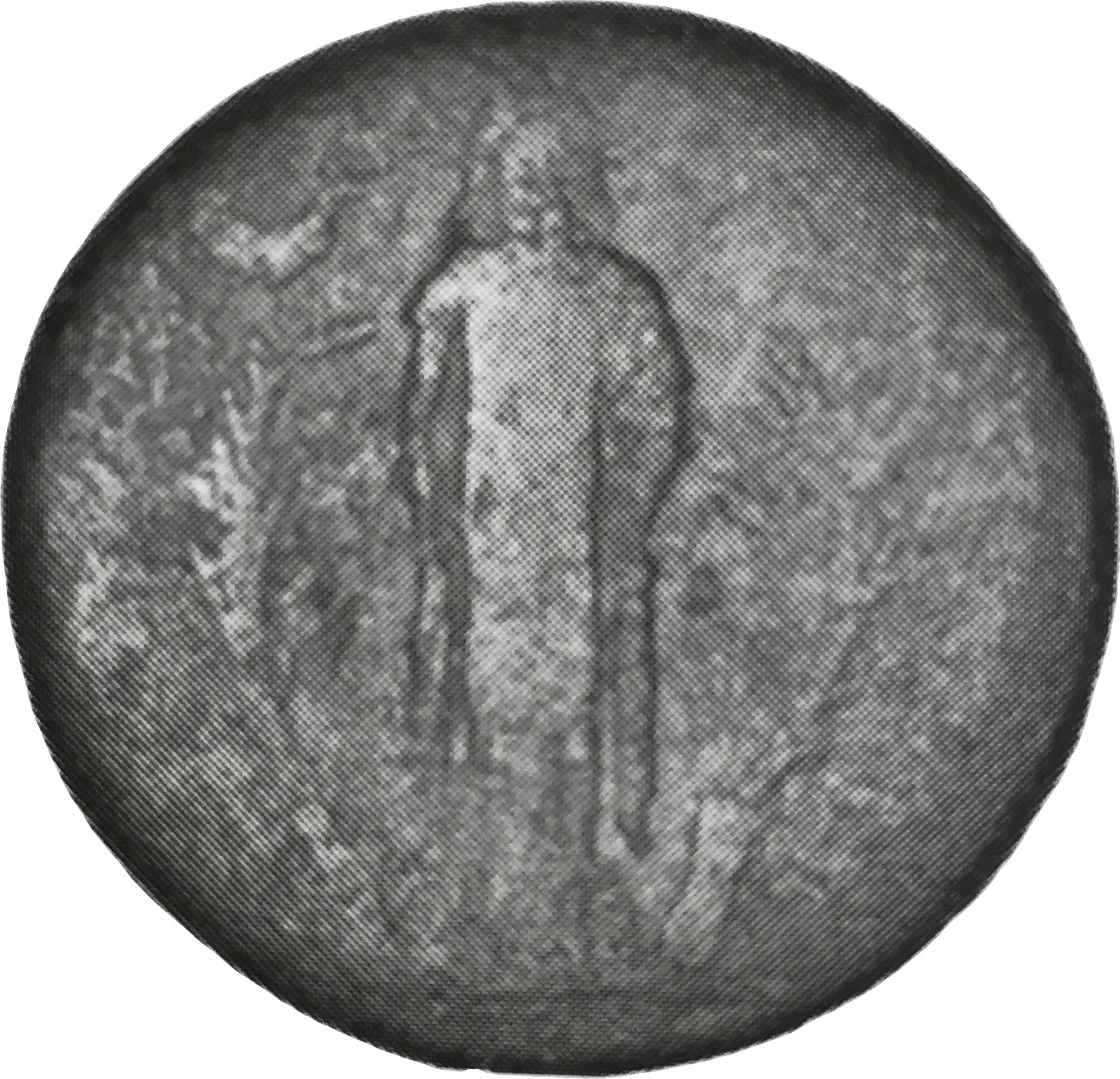 bearded male figure (Zeus Askraios?) standing, facing, wearing radiate crown; between two trees, in each of which a bird sits