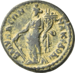 Tyche standing, left, wearing kalathos, holding rudder and cornucopia