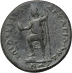 Mên standing with foot on bucranium, facing, head, left, wearing Phrygian cap, holding pine cone and long sceptre; behind his shoulders, crescent