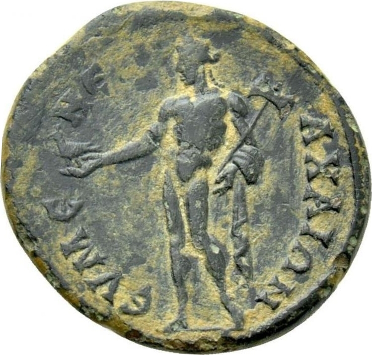 nude male figure (hero or Apollo?) standing, facing, head, left, holding bird (raven?), double axe and chlamys