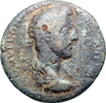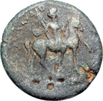 Apollo-Tyrimnaios on horseback, right, wearing radiate crown, naked but for chlamys, holding double axe |