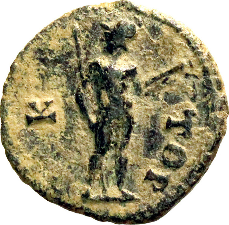 helmeted and nude Hector standing, facing, head, left, holding spear and sword