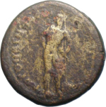 nude male figure (founding hero or athlete?) standing, facing, head, left(?), placing right hand behind back, resting on long spear (or sceptre?) |
