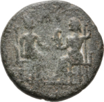 to left, figure (Tyche?) seated, right, holding uncertain object; to right, Zeus seated, left, holding eagle and long sceptre