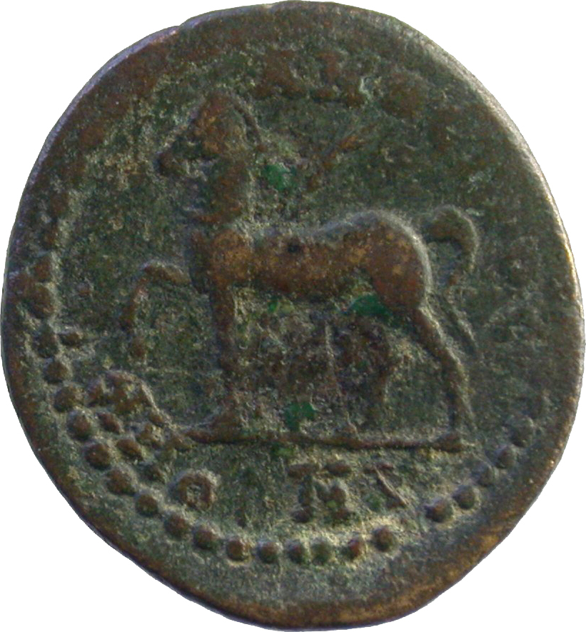horse trotting, left; above horse's back, palm-branch
