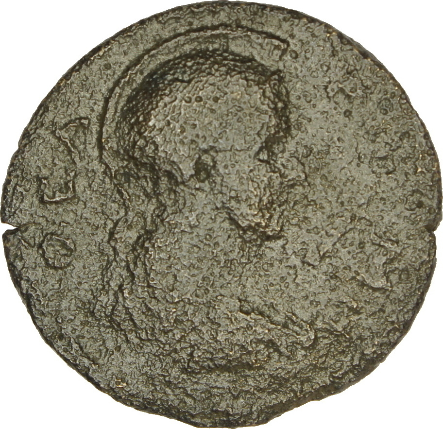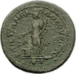 Homonoia standing, facing, head, left, wearing kalathos, holding patera over lighted altar and cornucopia |