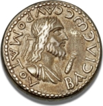 draped bust of Sauromates II wearing diadem, right; in front, club
