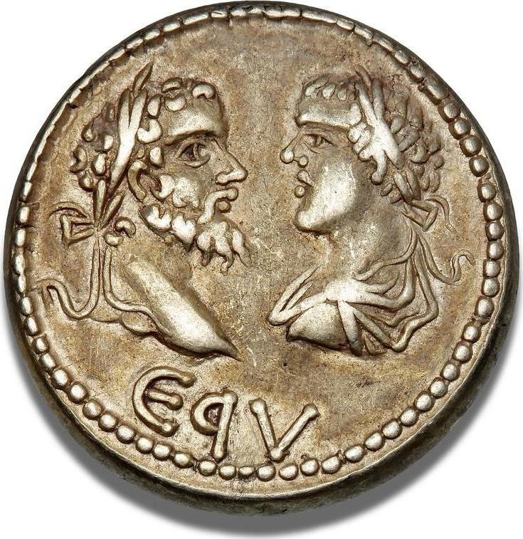 laureate heads of Septimius Severus (on left) and draped bust of Caracalla (on right, youthful), facing each other