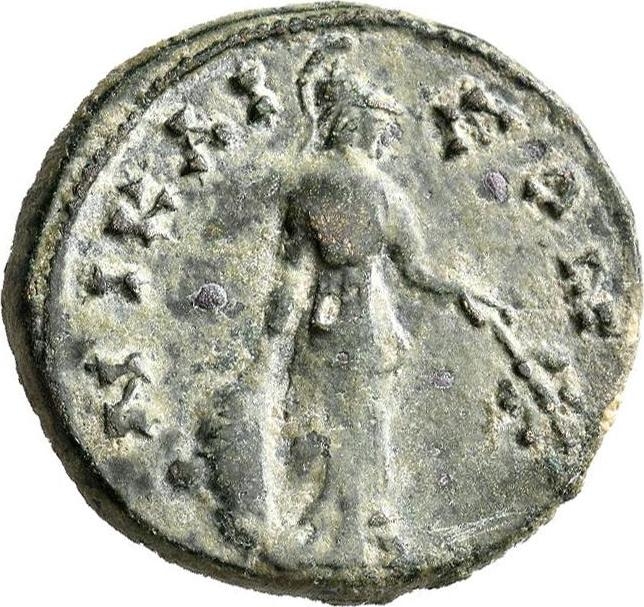 Athena standing, facing, head, right, resting arm on shield, holding olive-branch