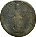 Tyche standing, left, wearing kalathos, holding rudder and cornucopia