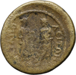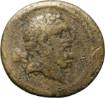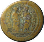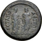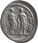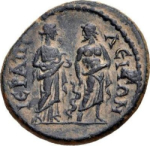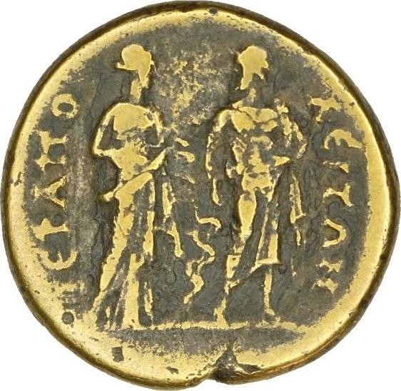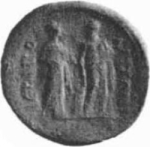 to left, Hygieia standing, facing, head, right, feeding serpent from patera; to right, Asclepius standing, facing, head, left, holding serpent-staff