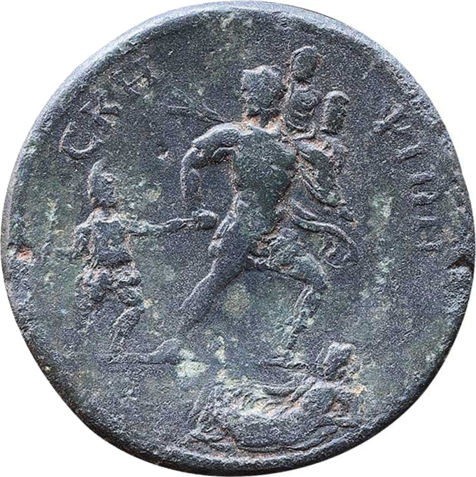Aeneas advancing, right, head, left, leading Ascanius and carrying Anchises; in exergue, river-god Skamandros reclining, left, resting arm on knee, resting on water-urn