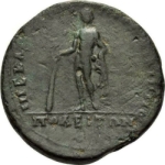 nude Heracles standing, facing, head, right, resting arm on club, holding lion skin |