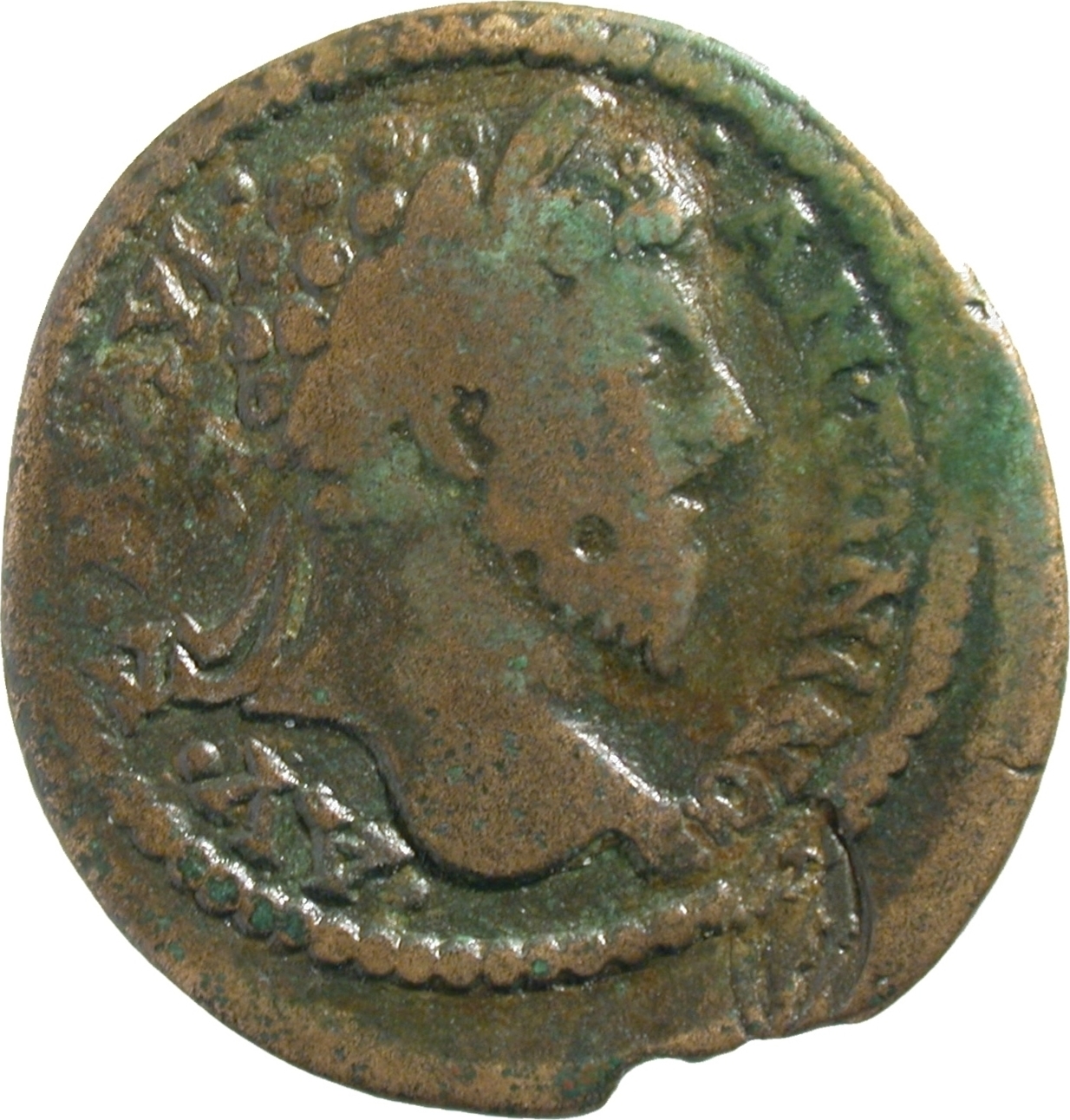 turreted Cybele seated, left, holding patera, resting arm on tympanum |