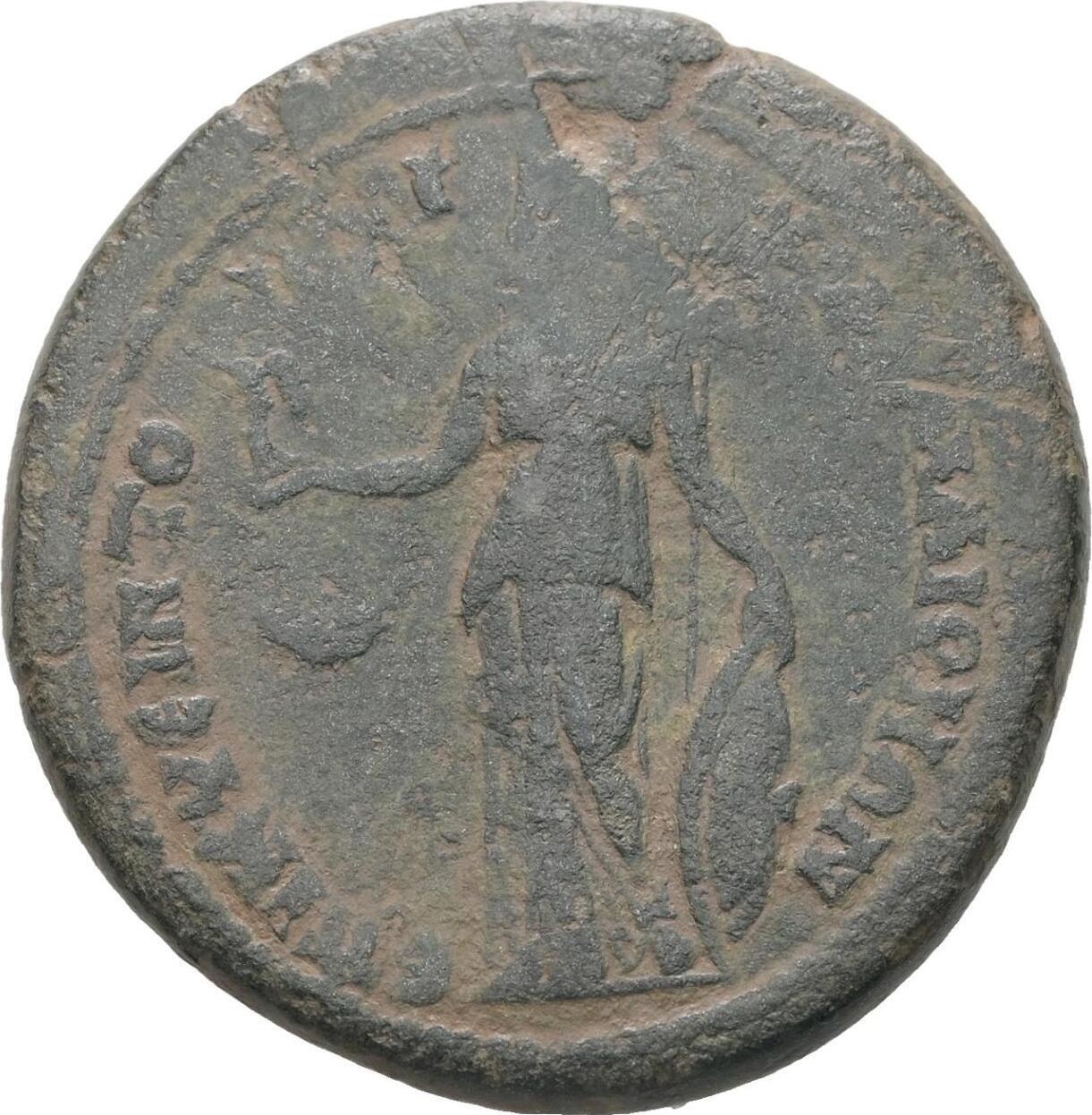 Athena standing, left, holding Nike, resting arm on shield; beside, spear |