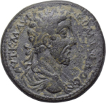 Apollo-Tyrimnaios on horseback, right, wearing radiate crown, naked but for chlamys, carrying double axe over shoulder; beneath horse's foreleg, lighted altar; to right, Hermes standing, facing, head, left, leading horse and holding caduceus; in background, cypress |