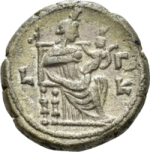 Isis, wearing basileion, seated, right; on knee, Harpocrates, crowned with skhent, holding lotus-flower, raising hand; on throne, hawk
