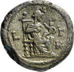 Isis, wearing basileion, seated, right; on knee, Harpocrates, crowned with skhent, raising hand, holding lotus-flower; on throne, hawk