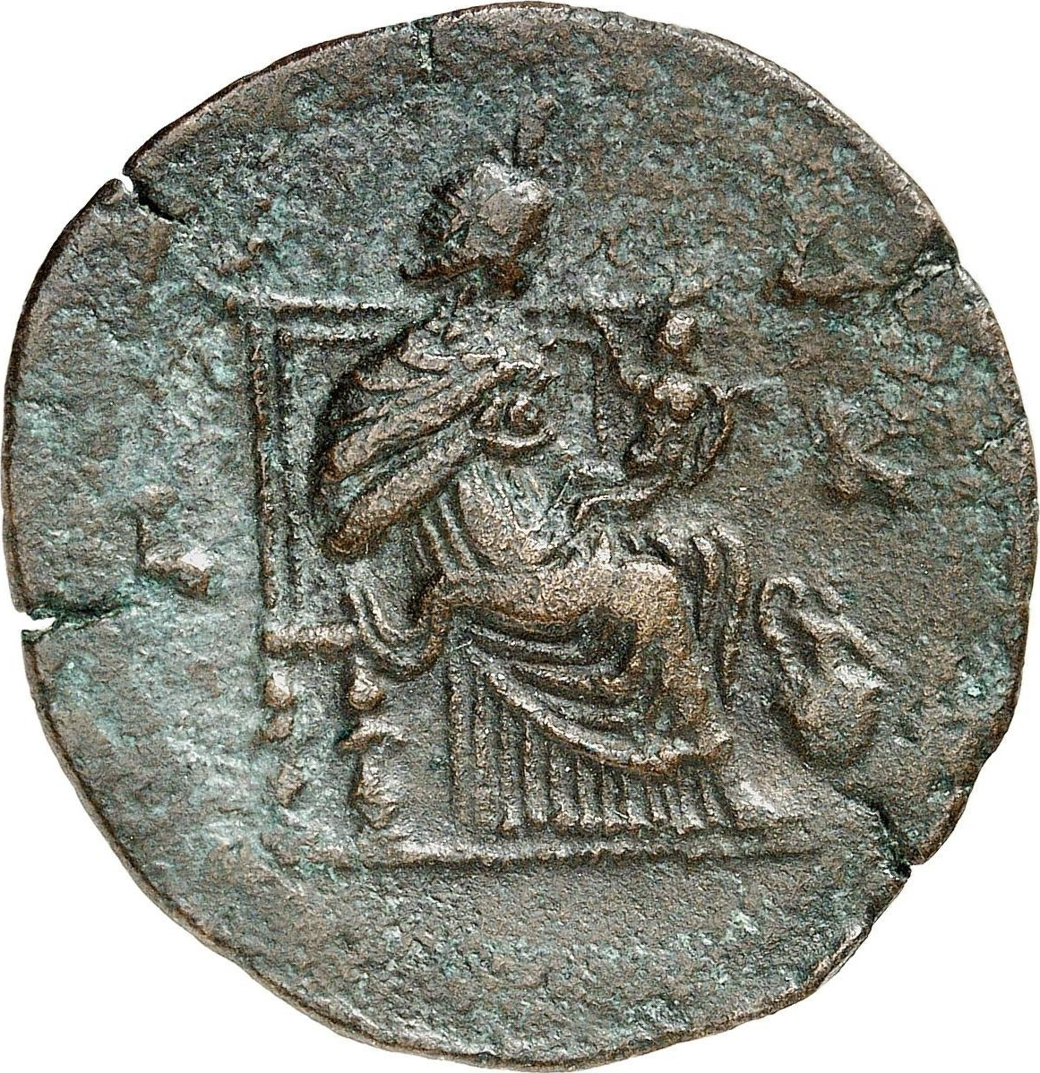 Isis, wearing basileion, seated, right; on knee, Harpocrates, crowned with skhent, holding lotus-flower, raising hand; (before, on ground, hydreion)