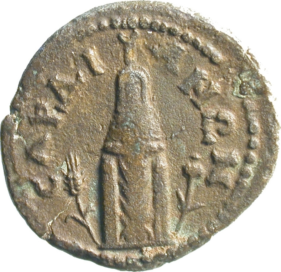 cult statue of Kore of Sardis standing, facing, wearing tall crown surmounted by crescent; to left, ear of corn; to right, poppy