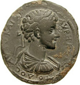 laureate-headed bust of Commodus (youthful) wearing cuirass and paludamentum, right, seen from centre