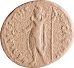 Mên Kamareites standing, facing, head, left, wearing Phrygian cap, holding patera and long sceptre; behind his shoulders, crescent