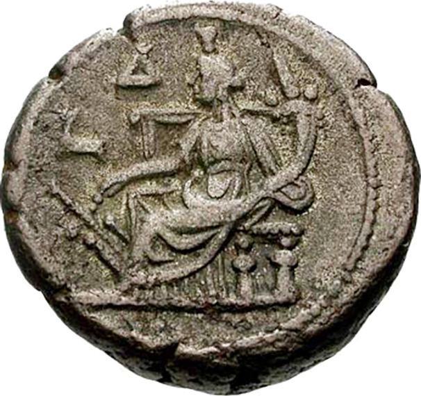 Tyche seated, left, wearing kalathos, resting hand on rudder, holding cornucopia