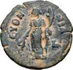 Euthenia standing, facing, head, left, holding two ears of corn and cornucopia