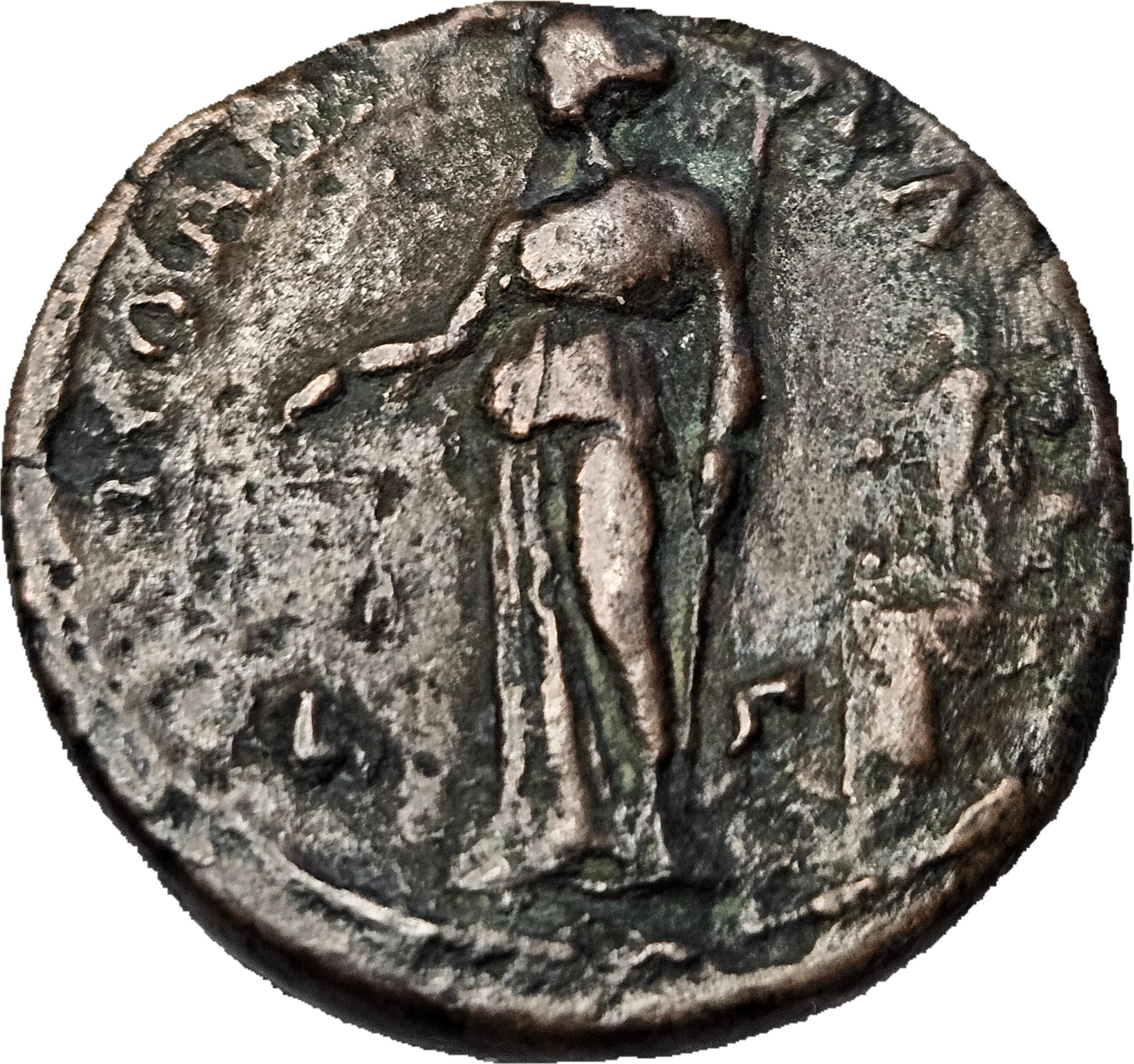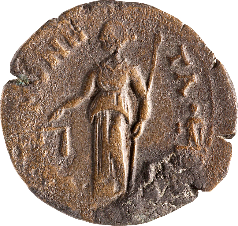 Moneta standing, facing, head, left, holding scales and sceptre; behind, Hermes standing on base, left, holding purse and ?