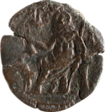 Ammon, wearing disk, seated on throne without a back(?), left, holding purse and sceptre; at his feet, ram crowned with disk