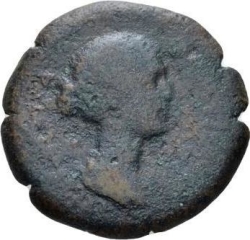 Tyche-Pantheia, helmeted and winged, standing, facing, head, left, holding rudder and cornucopia