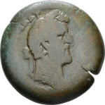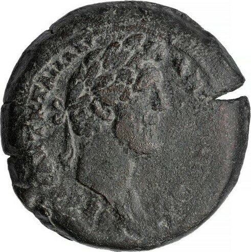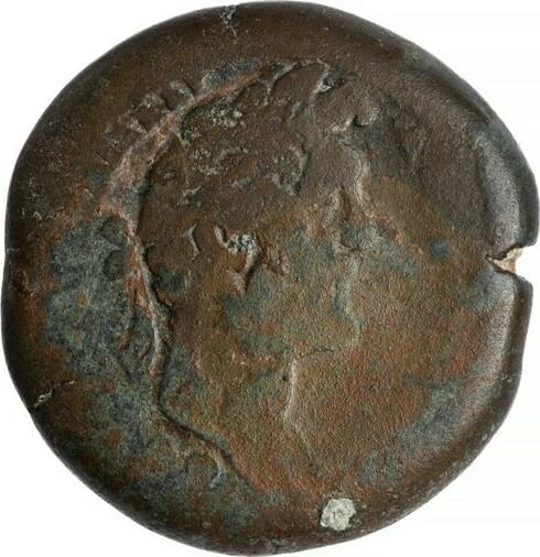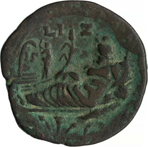 Nilus, with crocodile beside him, reclining left, holding reed and cornucopia, (from which issues Genius holding wreath); before, dome (inscribed ΙϚ), in front of which stands Genius (or beside which, Genius on back of another, inscribing dome); below, water-plants |