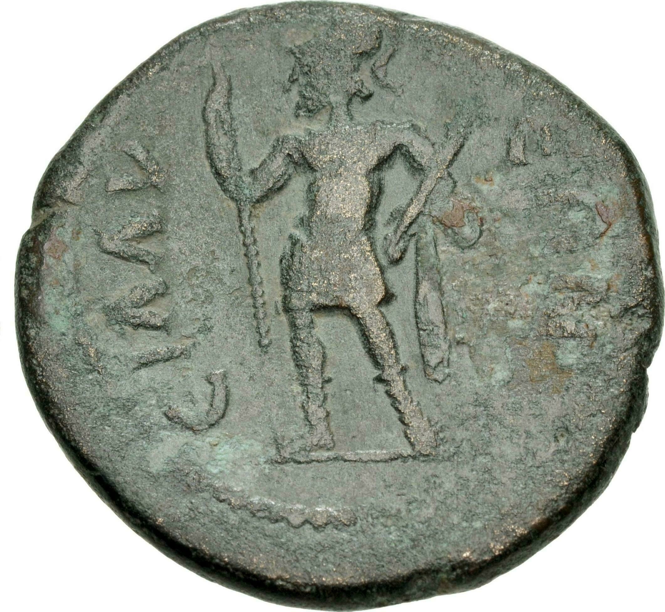 youthful founding hero (or emperor?) standing, left, holding spear, sword (or parazonium?) and chlamys