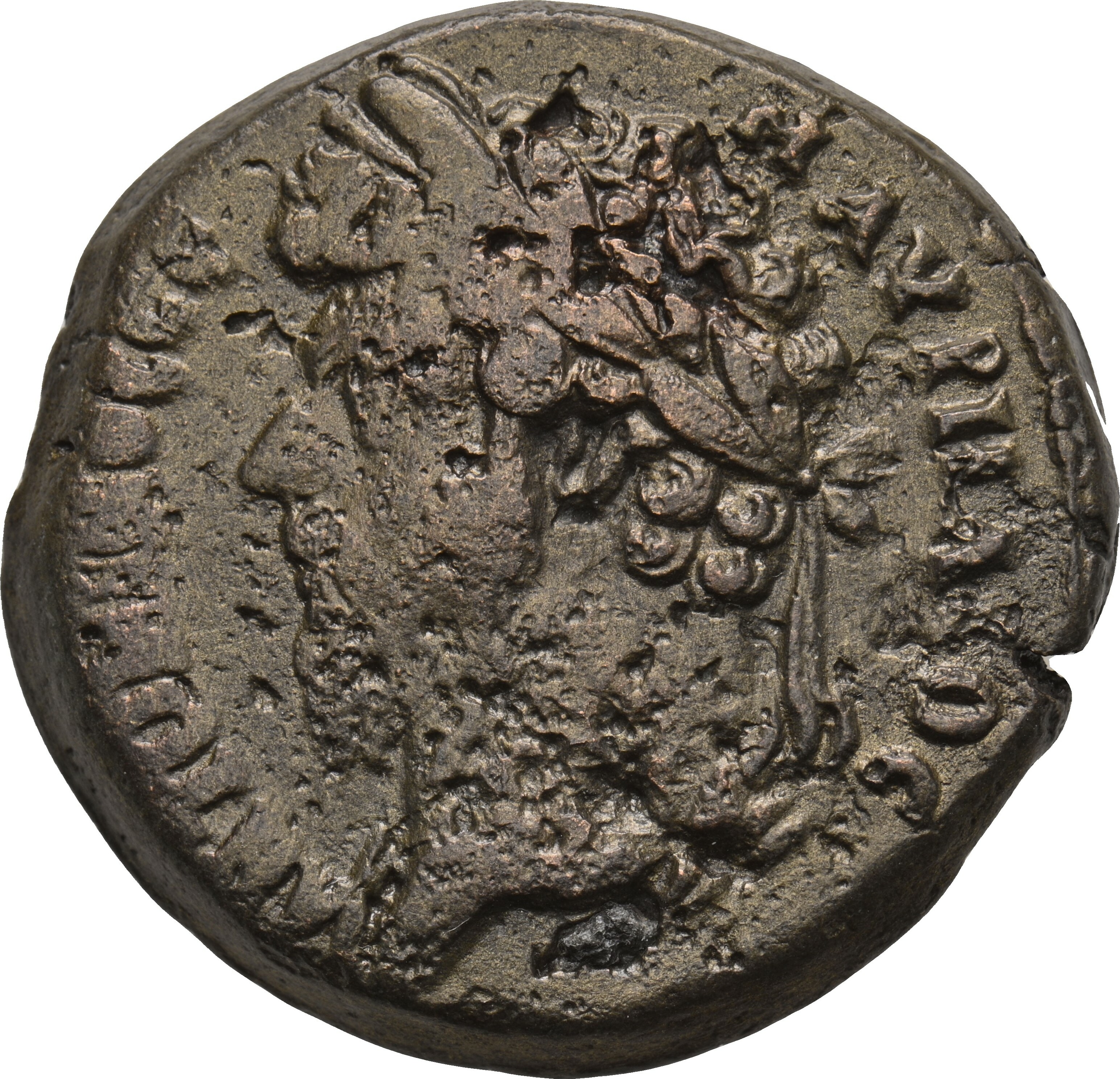 laureate head of Marcus Aurelius with traces of drapery, left